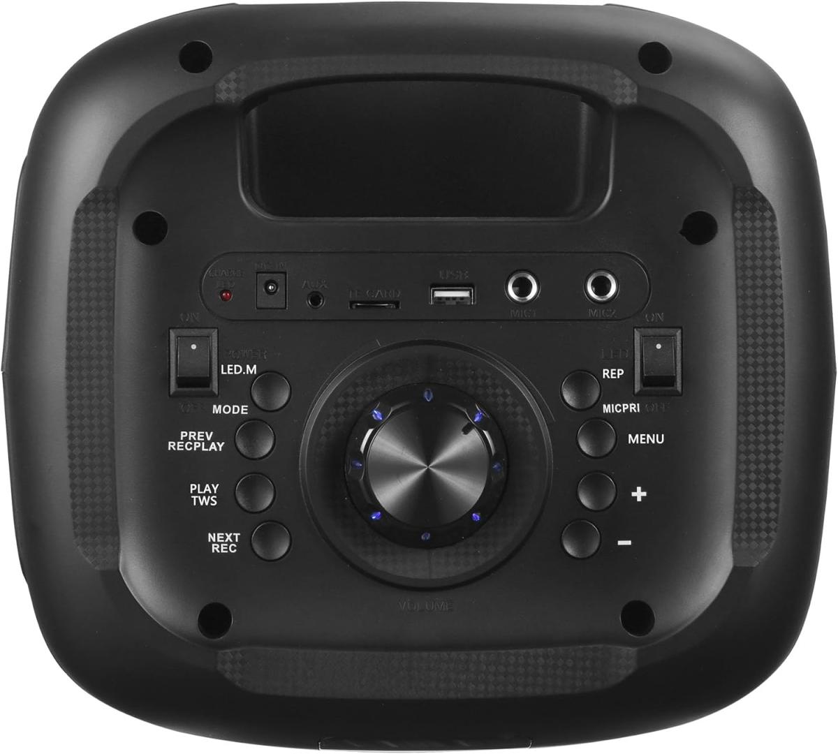 Dos parlantes de 10 con tweeter de 2”,sonido de alta fidelidad, potencia 80 wattsRMS, luces modo disco, conexión víaUSBy bluetooth, entrada auxiliar de 3.5Mm, doble entrada para micrófono, incluye control remoto y micrófono inalámbrico.